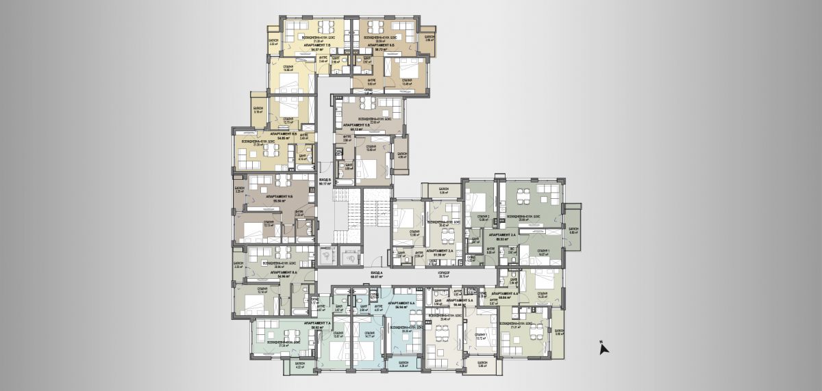 | Апартамент 6.А | 1 | Втори | 2 | юг | 56.94 | 67.8 | продадено | |||