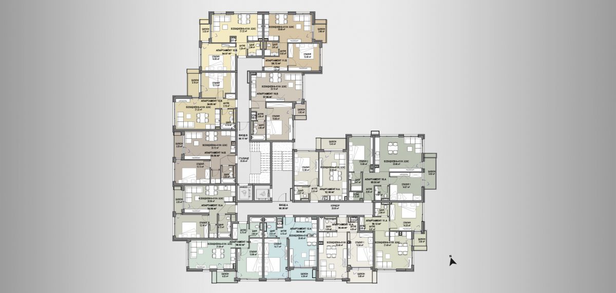 | Апартамент 11.Б | 2 | Трети | 2 | изток | 58.72 | 69.92 | продадено | |||