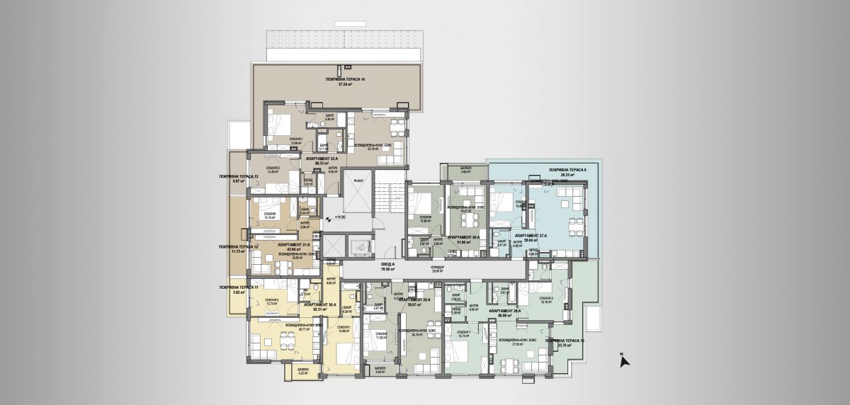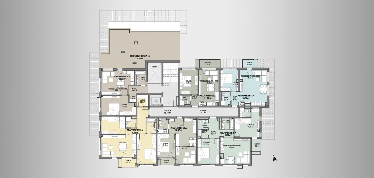 | Апартамент 13.А | 1 | Трети | 2 | юг | 56.94 | 67.8 | продадено | |||