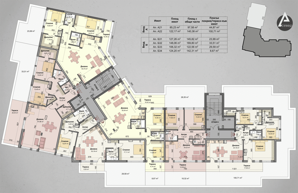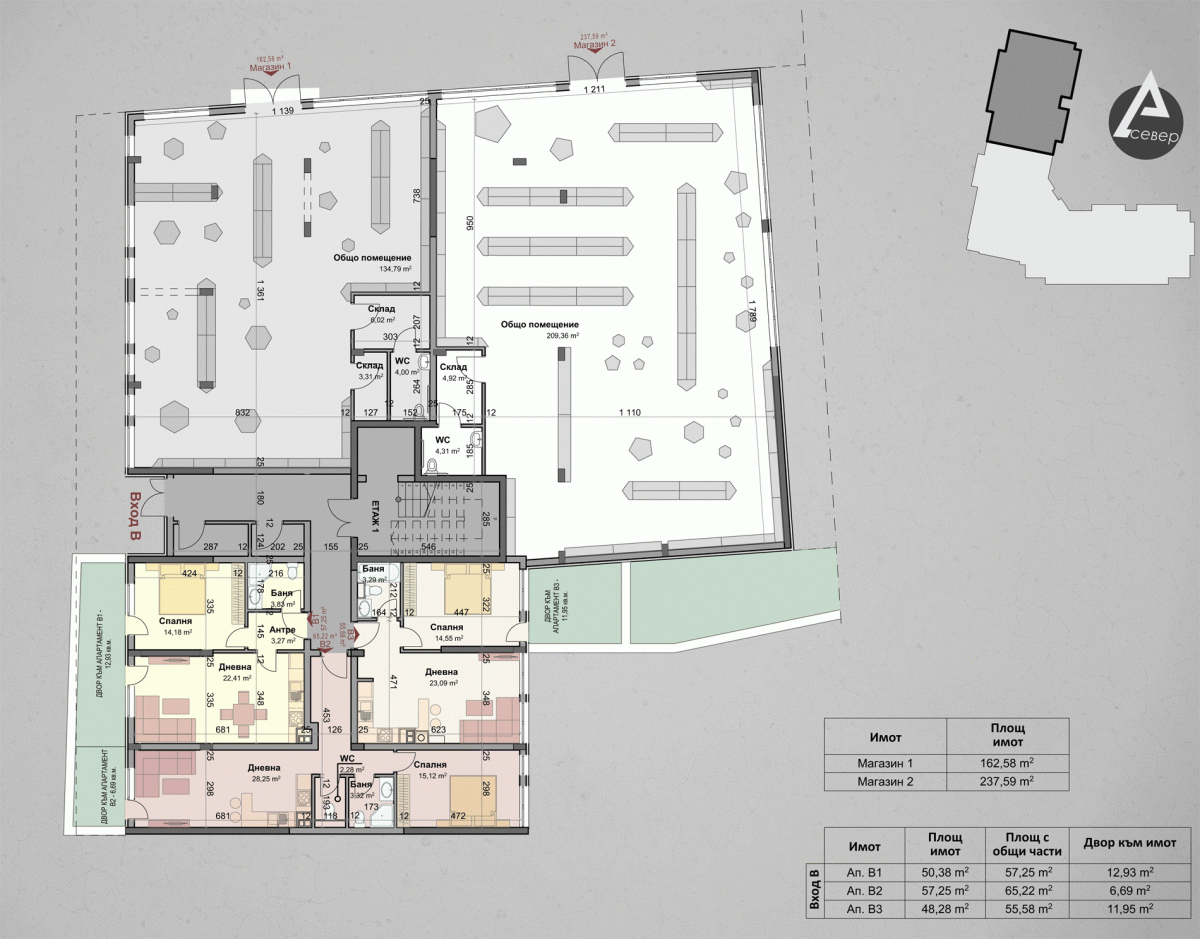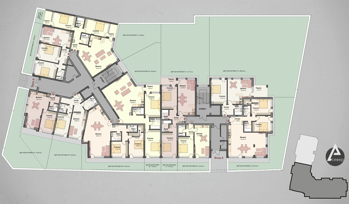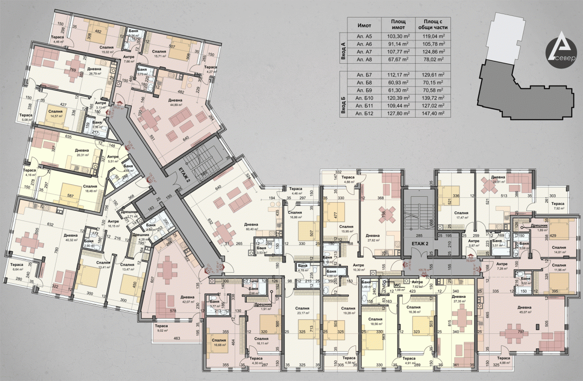 | Апартамент Б6 | 2 | Партер | 3 | юг,север,изток | 122.32 | 138.74 | продаден | |||