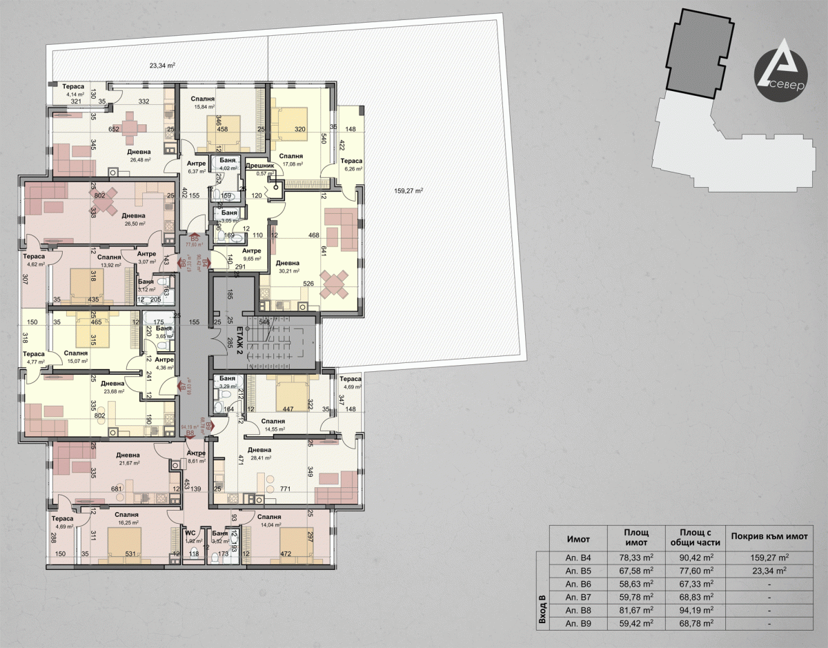 | Апартамент В4 | 3 | Втори | 2 | изток,север | 78.33 | 90.42 | продаден | |||