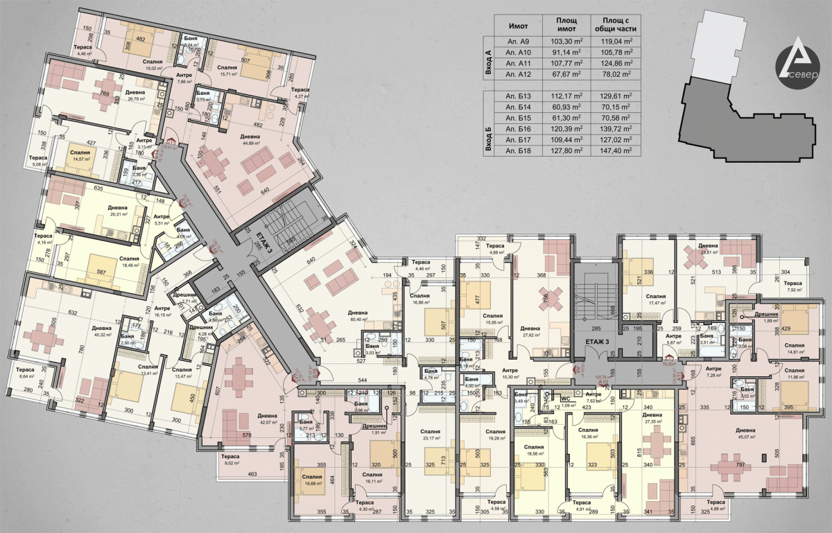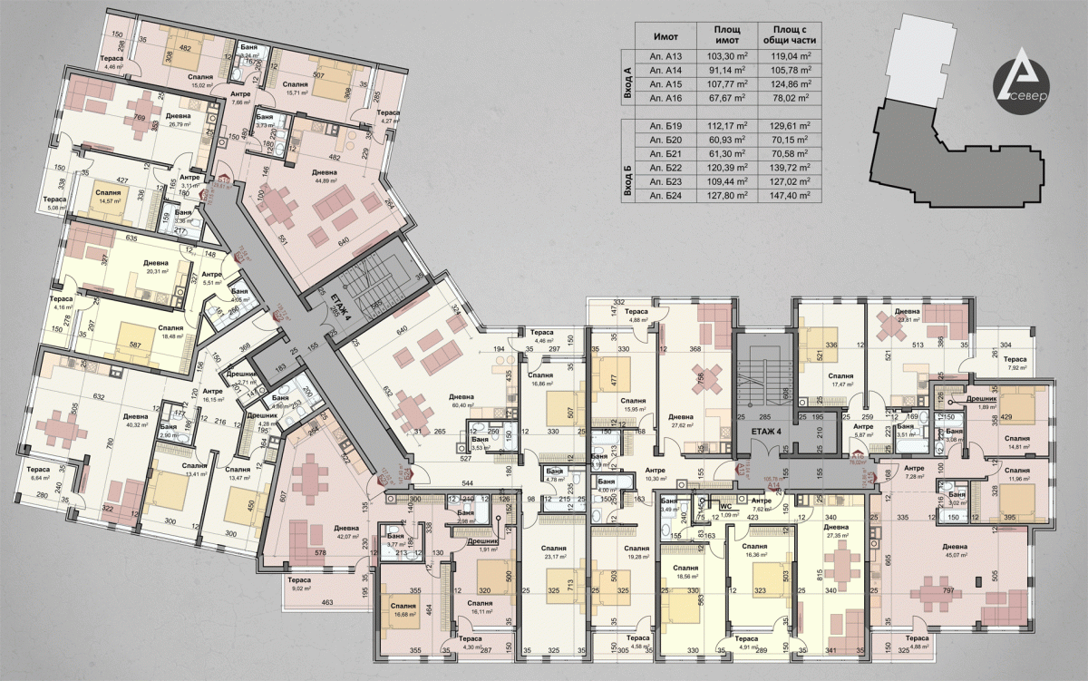 | Апартамент А13 | 1 | Четвърти | 3 | юг,север | 103.3 | 119.04 | продаден | |||