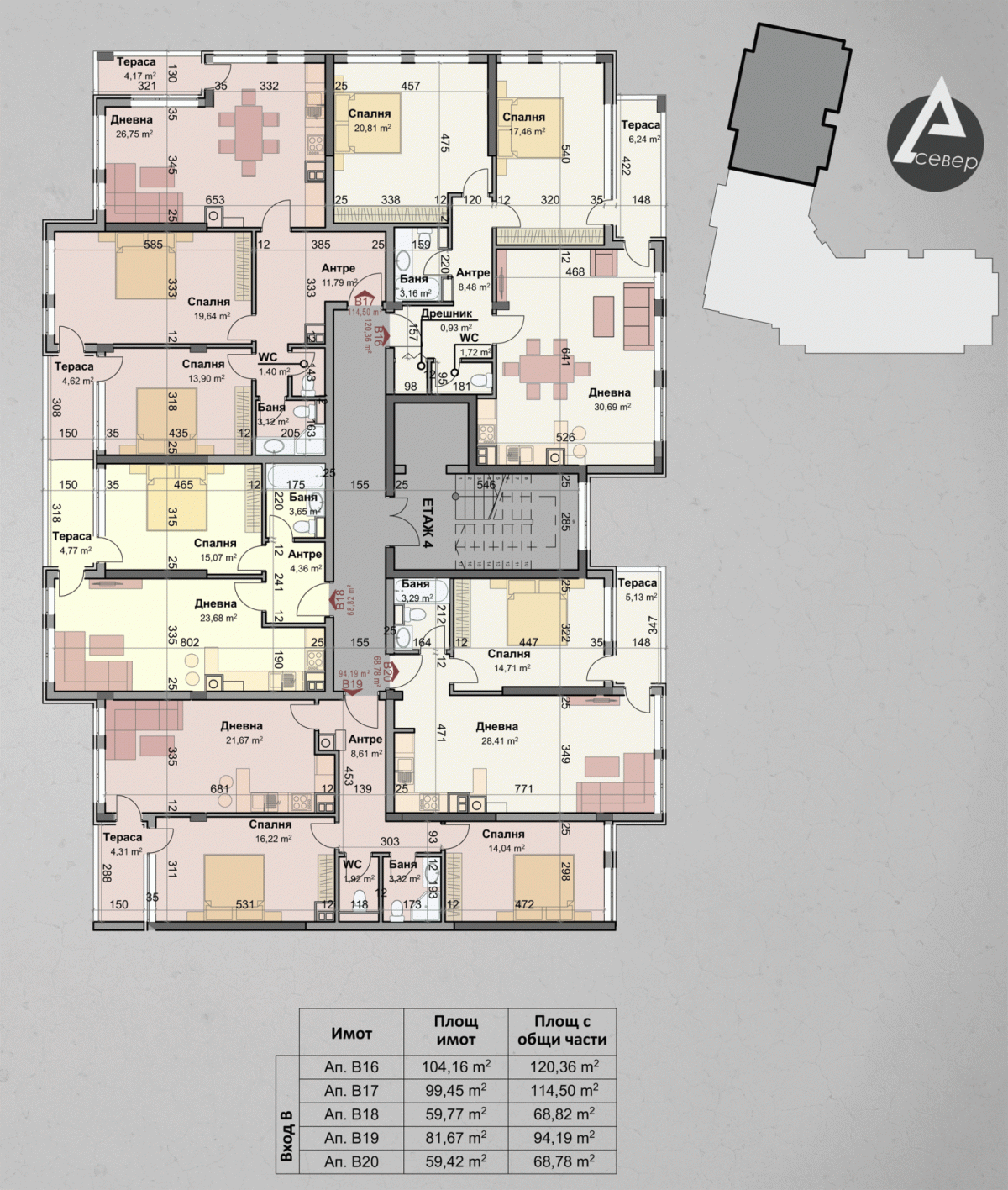 | Апартамент В24 | 3 | Пети | 3 | изток,запад | 87.27 | 94.19 | продаден | |||