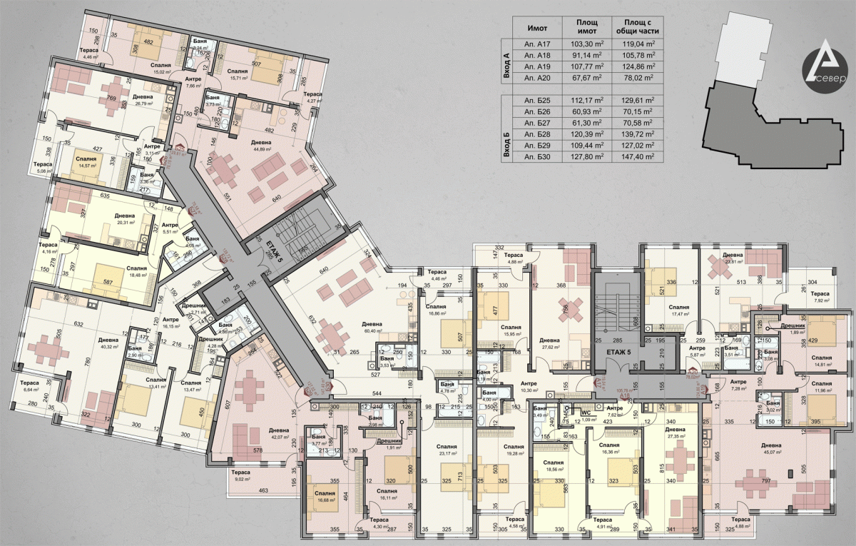 | Апартамент А17 | 1 | Пети | 3 | юг,север | 103.3 | 119.04 | продаден | |||