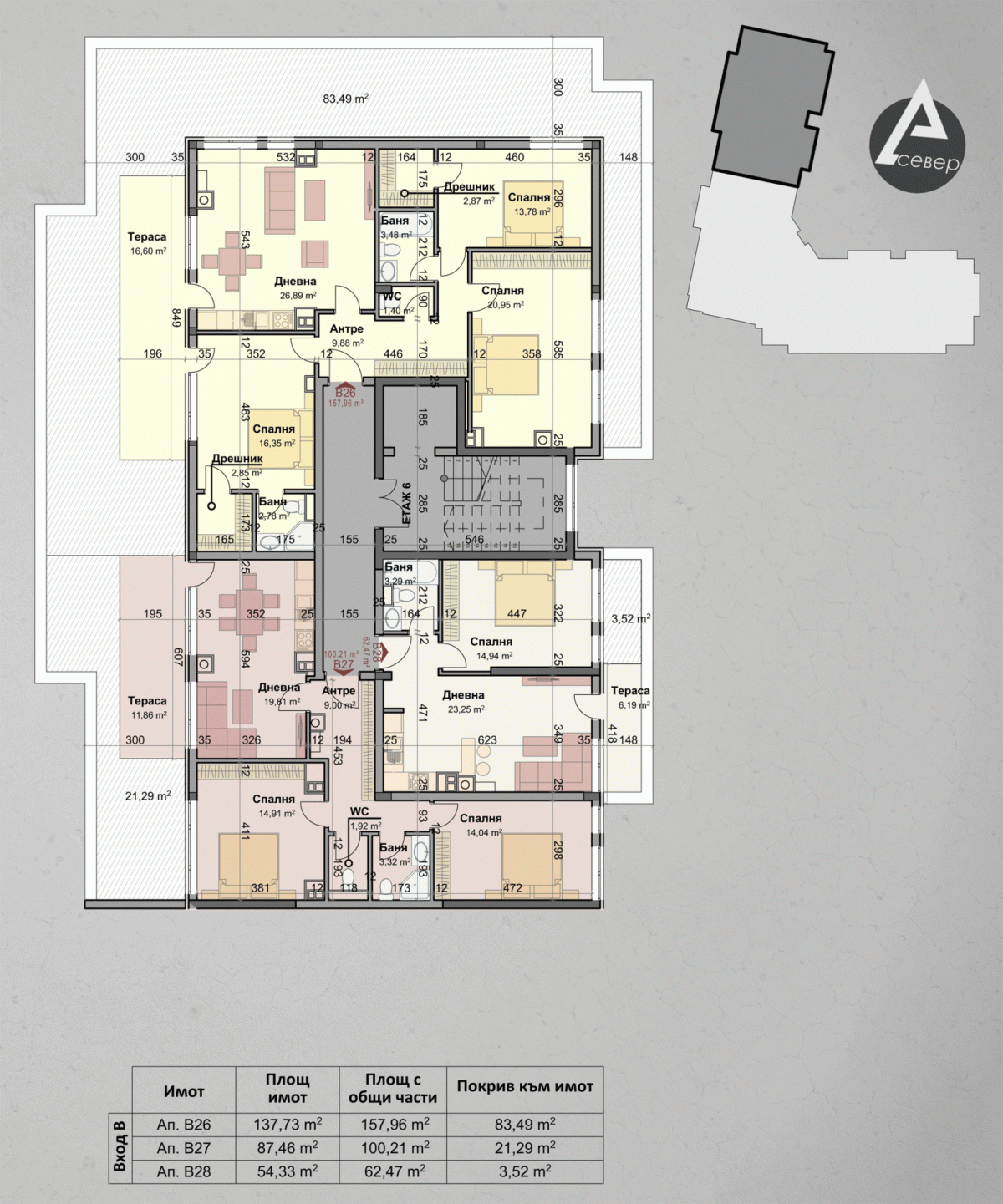 | Апартамент В26 | 3 | Шести | 4 | изток,запад,север | 137.73 | 157.96 | продаден | |||